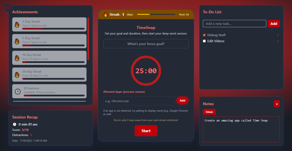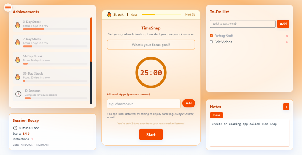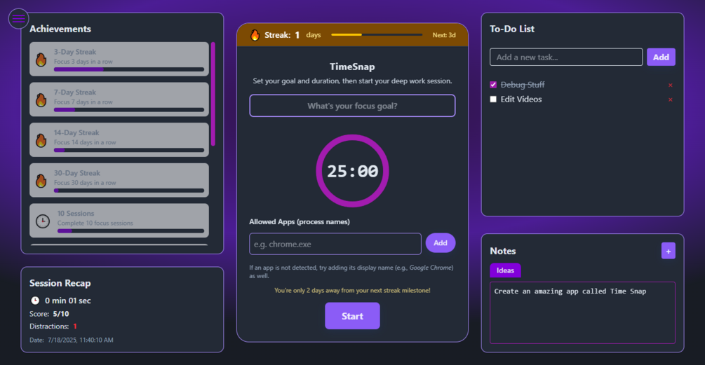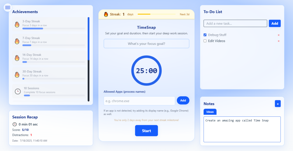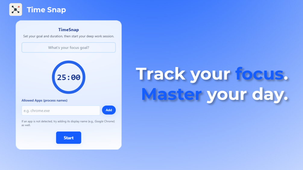 TimeSnap is your lightweight, elegant desktop companion for deep work and distraction management. With a clean interface, powerful analytics, and motivational features, TimeSnap helps you build focus habits that stick β all in a beautifully simple package.