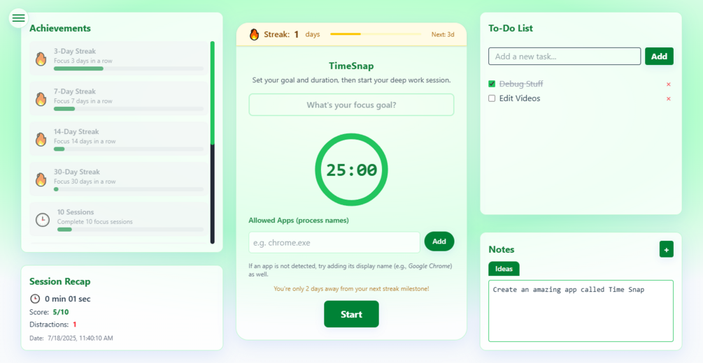 Set a goal, choose allowed apps, and stay focused. TimeSnap automatically tracks distractions based on app usage. - π§ Real-Time Scoring & Feedback